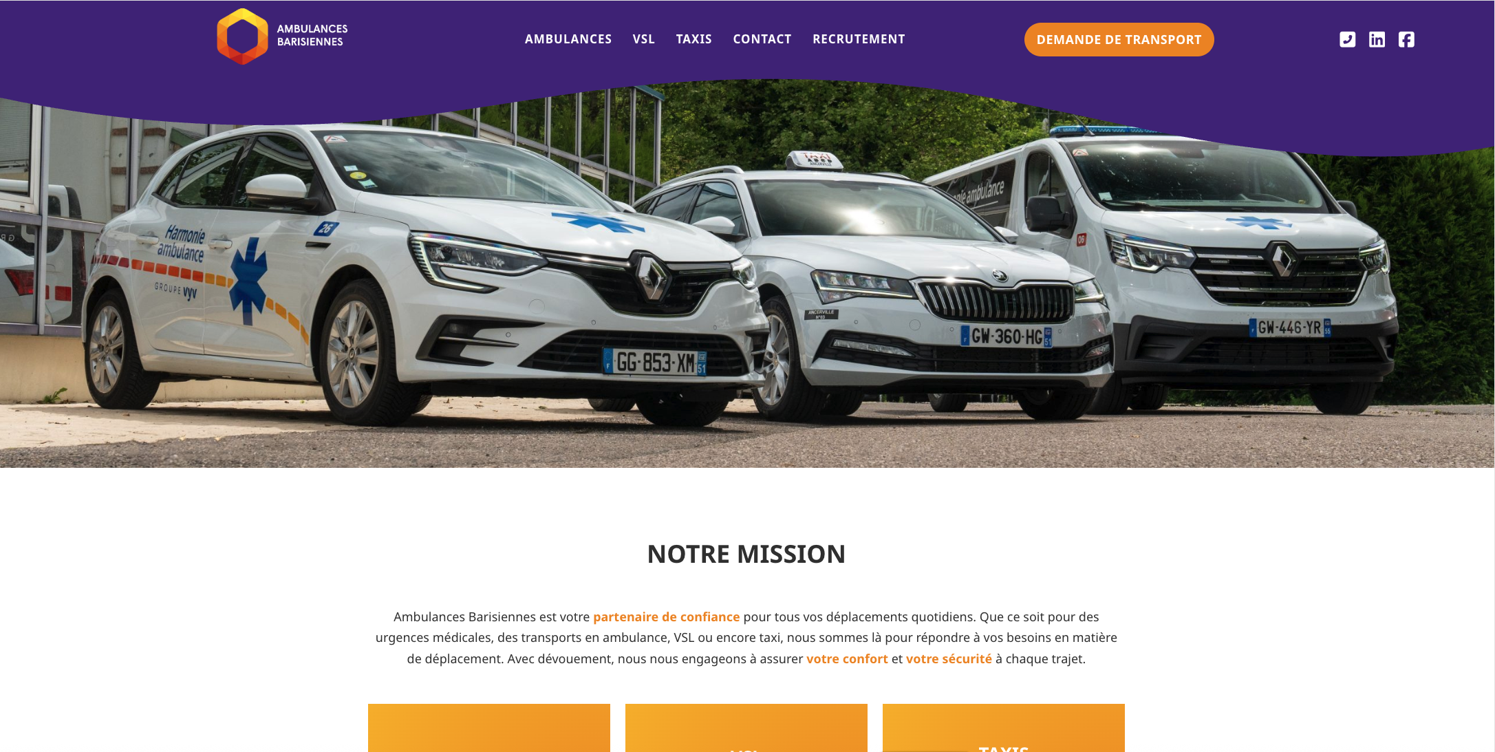 Les Ambulances Barisiennes souhaitaient se doter d’un site internet vitrine afin de présenter leurs services de transport sanitaire (ambulances, VSL, taxis) de manière claire et professionnelle, mettre en avant leur flotte de véhicules, leur équipe qualifiée et leurs équipements de pointe, faciliter la prise de contact avec un formulaire de demande de transport en ligne et ainsi renforcer leur visibilité locale et leur crédibilité auprès des patients, des professionnels de santé et des partenaires.