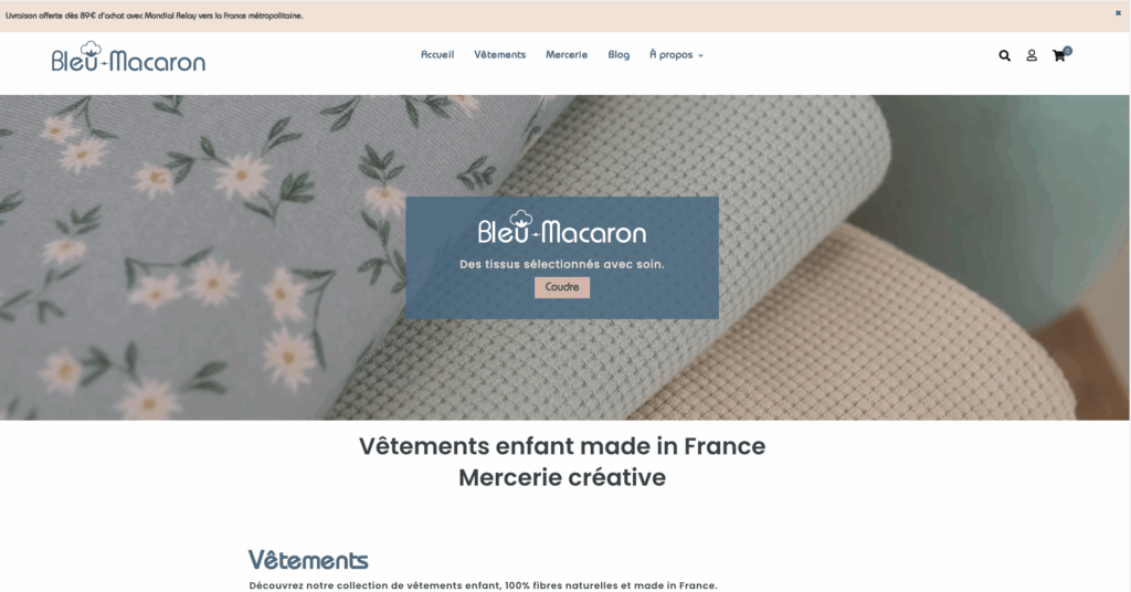 FORMULAIRE DE CONTACTBleu Macaron souhaitait concevoir un site internet pour présenter ses collections de vêtements pour enfants, mettre en avant ses engagements écoresponsables et permettre aux clients de découvrir et acheter facilement ses produits en ligne.