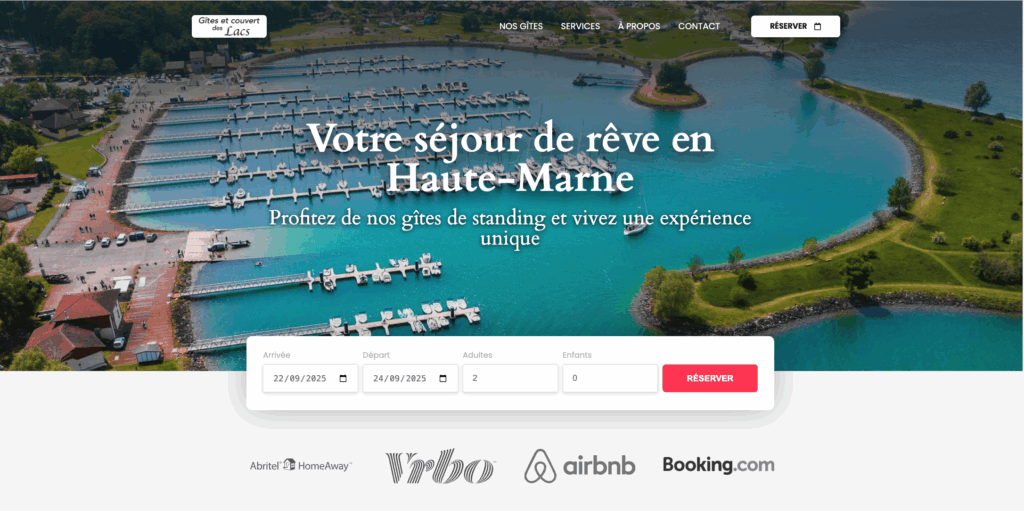 Pour répondre à cette demande, nous avons conçu et développé un site moderne, fonctionnel et ergonomique, mettant en valeur les gîtes à travers des galeries photos de qualité, incluant à la fois des prises de vue classiques et aériennes. Chaque gîte dispose d’une présentation détaillée avec les équipements, la capacité d’accueil, les espaces de vie et les services proposés.